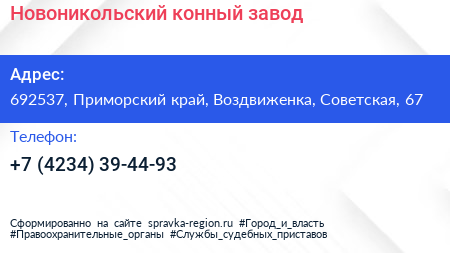 Новоникольский конный завод по адресу 692537, Приморский край, Воздвиженка, Советская, 67 в дальнейшем Организация, размещена в следующих категориях: