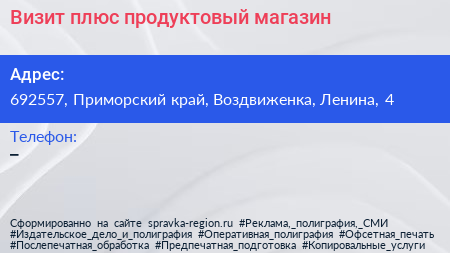 Визит плюс, продуктовый магазин по адресу 692557, Приморский край, Воздвиженка, Ленина, 4 в дальнейшем Организация, размещена в следующих категориях: