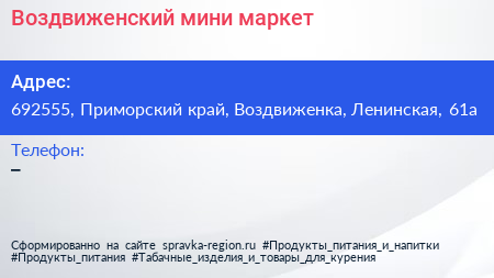 Воздвиженский, мини-маркет по адресу 692555, Приморский край, Воздвиженка, Ленинская, 61а в дальнейшем Организация, размещена в следующих категориях: