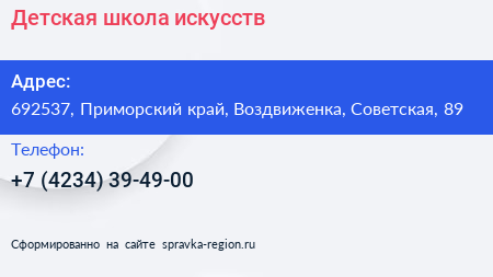 Детская школа искусств по адресу 692537, Приморский край, Воздвиженка, Советская, 89 в дальнейшем Организация, размещена в следующих категориях: