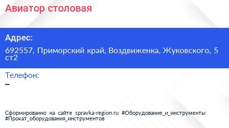 Авиатор, столовая по адресу 692557, Приморский край, Воздвиженка, Жуковского, 5 ст2 в дальнейшем Организация, размещена в следующих категориях: