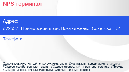 NPS, терминал по адресу 692537, Приморский край, Воздвиженка, Советская, 51 в дальнейшем Организация, размещена в следующих категориях: