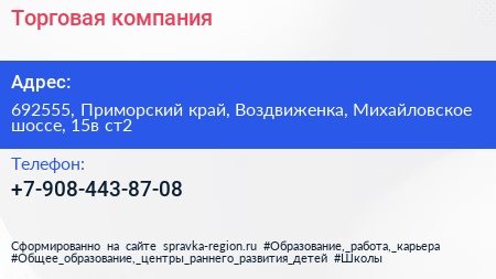 Торговая компания по адресу 692555, Приморский край, Воздвиженка, Михайловское шоссе, 15в ст2 в дальнейшем Организация, размещена в следующих категориях: