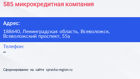 585, микрокредитная компания по адресу 188640, Ленинградская область, Всеволожск, Всеволожский проспект, 55а в дальнейшем Организация, размещена в следующих категориях: