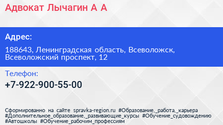 Адвокат Лычагин А.А. по адресу 188643, Ленинградская область, Всеволожск, Всеволожский проспект, 12 в дальнейшем Организация, размещена в следующих категориях: