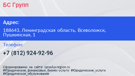 БС-Групп по адресу 188643, Ленинградская область, Всеволожск, Пушкинская, 1 в дальнейшем Организация, размещена в следующих категориях: