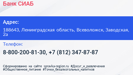 Банк СИАБ по адресу 188643, Ленинградская область, Всеволожск, Заводская, 2а в дальнейшем Организация, размещена в следующих категориях: