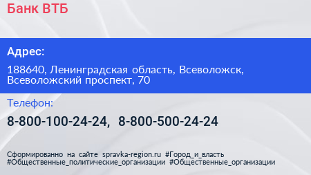 Банк ВТБ по адресу 188640, Ленинградская область, Всеволожск, Всеволожский проспект, 70 в дальнейшем Организация, размещена в следующих категориях:
