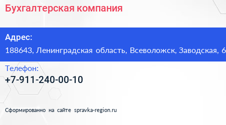 Бухгалтерская компания по адресу 188643, Ленинградская область, Всеволожск, Заводская, 6 в дальнейшем Организация, размещена в следующих категориях: