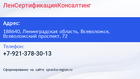 ЛенСертификацияКонсалтинг по адресу 188640, Ленинградская область, Всеволожск, Всеволожский проспект, 72 в дальнейшем Организация, размещена в следующих категориях: