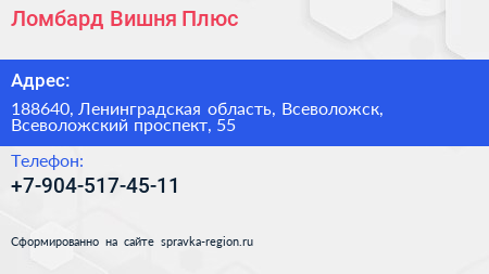 Ломбард Вишня Плюс по адресу 188640, Ленинградская область, Всеволожск, Всеволожский проспект, 55 в дальнейшем Организация, размещена в следующих категориях:
