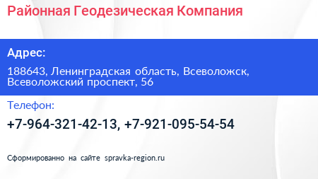 Районная Геодезическая Компания по адресу 188643, Ленинградская область, Всеволожск, Всеволожский проспект, 56 в дальнейшем Организация, размещена в следующих категориях: