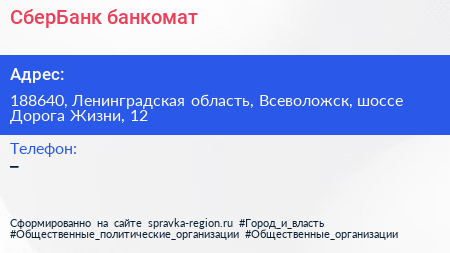 СберБанк, банкомат по адресу 188640, Ленинградская область, Всеволожск, шоссе Дорога Жизни, 12 в дальнейшем Организация, размещена в следующих категориях: