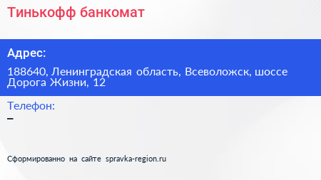 Тинькофф, банкомат по адресу 188640, Ленинградская область, Всеволожск, шоссе Дорога Жизни, 12 в дальнейшем Организация, размещена в следующих категориях: