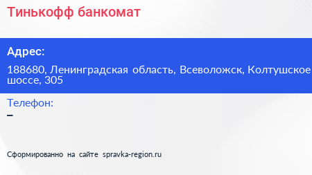 Тинькофф, банкомат по адресу 188680, Ленинградская область, Всеволожск, Колтушское шоссе, 305 в дальнейшем Организация, размещена в следующих категориях: