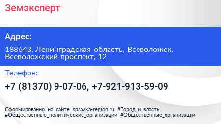 Земэксперт по адресу 188643, Ленинградская область, Всеволожск, Всеволожский проспект, 12 в дальнейшем Организация, размещена в следующих категориях: