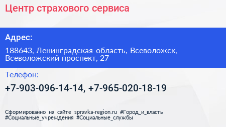 Центр страхового сервиса по адресу 188643, Ленинградская область, Всеволожск, Всеволожский проспект, 27 в дальнейшем Организация, размещена в следующих категориях: