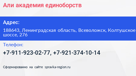 Али, академия единоборств по адресу 188643, Ленинградская область, Всеволожск, Колтушское шоссе, 276 в дальнейшем Организация, размещена в следующих категориях: