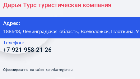 Дарья-Турс, туристическая компания по адресу 188643, Ленинградская область, Всеволожск, Плоткина, 9 в дальнейшем Организация, размещена в следующих категориях: