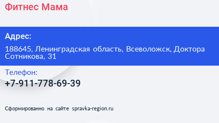 Фитнес Мама по адресу 188645, Ленинградская область, Всеволожск, Доктора Сотникова, 31 в дальнейшем Организация, размещена в следующих категориях: