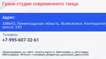 Грани, студия современного танца по адресу 188643, Ленинградская область, Всеволожск, Колтушское шоссе, 110 в дальнейшем Организация, размещена в следующих категориях:
