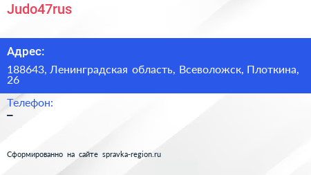 Judo47rus по адресу 188643, Ленинградская область, Всеволожск, Плоткина, 26 в дальнейшем Организация, размещена в следующих категориях: