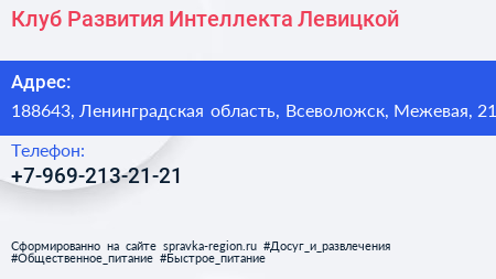 Клуб Развития Интеллекта Левицкой по адресу 188643, Ленинградская область, Всеволожск, Межевая, 21 в дальнейшем Организация, размещена в следующих категориях: