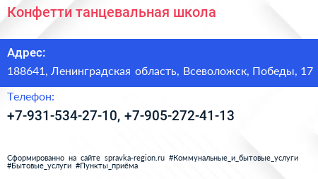 Конфетти, танцевальная школа по адресу 188641, Ленинградская область, Всеволожск, Победы, 17 в дальнейшем Организация, размещена в следующих категориях: