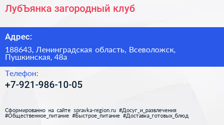 ЛубЪянка, загородный клуб по адресу 188643, Ленинградская область, Всеволожск, Пушкинская, 48а в дальнейшем Организация, размещена в следующих категориях: