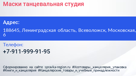 Маски, танцевальная студия по адресу 188645, Ленинградская область, Всеволожск, Московская, 6 в дальнейшем Организация, размещена в следующих категориях: