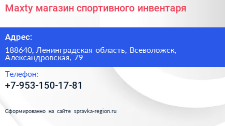 Maxty, магазин спортивного инвентаря по адресу 188640, Ленинградская область, Всеволожск, Александровская, 79 в дальнейшем Организация, размещена в следующих категориях: