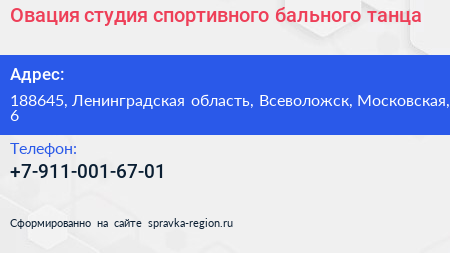 Овация, студия спортивного бального танца по адресу 188645, Ленинградская область, Всеволожск, Московская, 6 в дальнейшем Организация, размещена в следующих категориях: