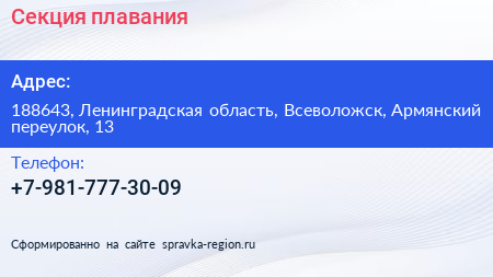 Секция плавания по адресу 188643, Ленинградская область, Всеволожск, Армянский переулок, 13 в дальнейшем Организация, размещена в следующих категориях:
