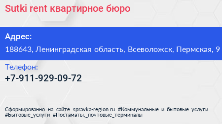 Sutki.rent, квартирное бюро по адресу 188643, Ленинградская область, Всеволожск, Пермская, 9 в дальнейшем Организация, размещена в следующих категориях: