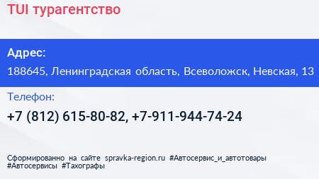 TUI, турагентство по адресу 188645, Ленинградская область, Всеволожск, Невская, 13 в дальнейшем Организация, размещена в следующих категориях: