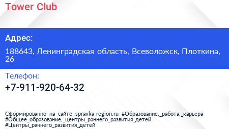 Tower Club по адресу 188643, Ленинградская область, Всеволожск, Плоткина, 26 в дальнейшем Организация, размещена в следующих категориях: