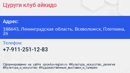 Цуруги, клуб айкидо по адресу 188643, Ленинградская область, Всеволожск, Плоткина, 26 в дальнейшем Организация, размещена в следующих категориях: