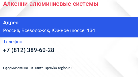 Алкенни алюминиевые системы по адресу Индустриальная улица, Щеглово (торфопредприятие), Город Всеволожск, Всеволожский район, Ленинградская область, Северо-Западный федеральный округ, 188676, Россия в дальнейшем Организация, размещена в следующих категориях:
