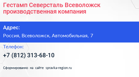 Гестамп Северсталь Всеволожск, производственная компания по адресу Автомобильная улица, Щеглово (торфопредприятие), Город Всеволожск, Всеволожский район, Ленинградская область, Северо-Западный федеральный округ, 188676, Россия в дальнейшем Организация, размещена в следующих категориях: