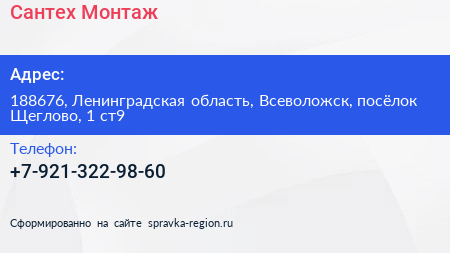 Сантех Монтаж по адресу 188676, Ленинградская область, Всеволожск, посёлок Щеглово, 1 ст9 в дальнейшем Организация, размещена в следующих категориях: