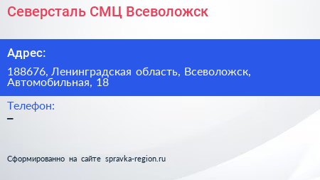 Северсталь-СМЦ-Всеволожск по адресу 188676, Ленинградская область, Всеволожск, Автомобильная, 18 в дальнейшем Организация, размещена в следующих категориях: