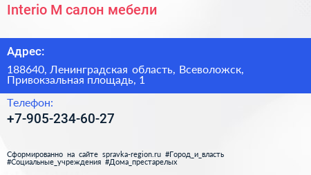 Interio M, салон мебели по адресу 188640, Ленинградская область, Всеволожск, Привокзальная площадь, 1 в дальнейшем Организация, размещена в следующих категориях: