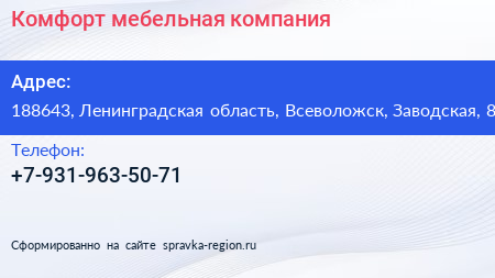 Комфорт, мебельная компания по адресу 188643, Ленинградская область, Всеволожск, Заводская, 8 в дальнейшем Организация, размещена в следующих категориях: