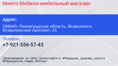 Много Мебели, мебельный магазин по адресу 188640, Ленинградская область, Всеволожск, Всеволожский проспект, 61 в дальнейшем Организация, размещена в следующих категориях:
