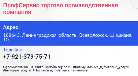 ПрофСервис, торгово-производственная компания по адресу 188643, Ленинградская область, Всеволожск, Шишканя, 10 в дальнейшем Организация, размещена в следующих категориях: