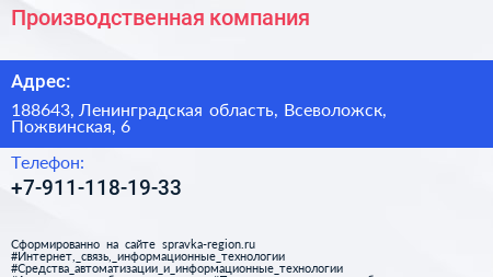 Производственная компания по адресу 188643, Ленинградская область, Всеволожск, Пожвинская, 6 в дальнейшем Организация, размещена в следующих категориях: