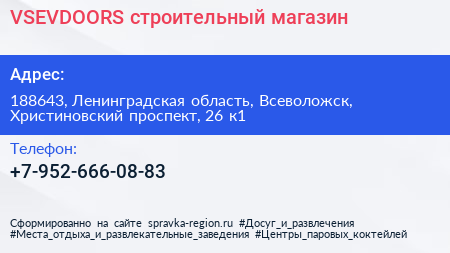 VSEVDOORS, строительный магазин по адресу 188643, Ленинградская область, Всеволожск, Христиновский проспект, 26 к1 в дальнейшем Организация, размещена в следующих категориях: