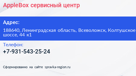 AppleBox, сервисный центр по адресу 188640, Ленинградская область, Всеволожск, Колтушское шоссе, 44 к1 в дальнейшем Организация, размещена в следующих категориях: