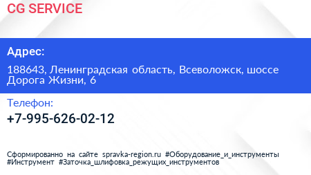 CG SERVICE по адресу 188643, Ленинградская область, Всеволожск, шоссе Дорога Жизни, 6 в дальнейшем Организация, размещена в следующих категориях: