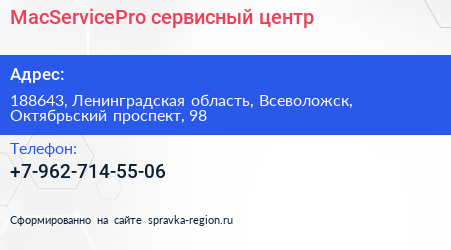 MacServicePro, сервисный центр по адресу 188643, Ленинградская область, Всеволожск, Октябрьский проспект, 98 в дальнейшем Организация, размещена в следующих категориях: